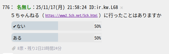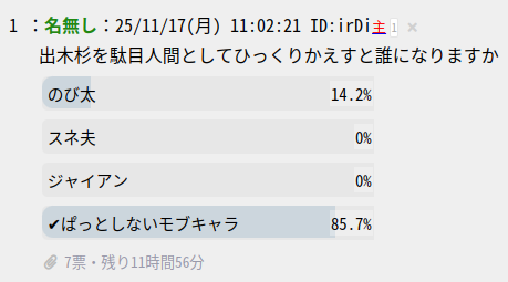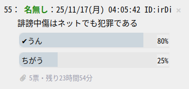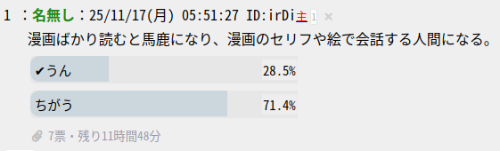 | … | 26無題Name名無し 25/11/17(月)22:37:09 IP:14.9.*(enabler.ne.jp)No.1801509+投票結果 |