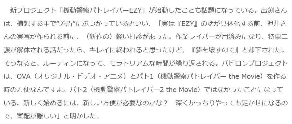 パトレイバーEZYは劇場版公開の三部作削除された記事が9件あります.見る