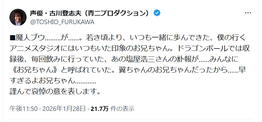 | … | 3無題Name名無し 26/01/28(水)14:19:12 IP:14.9.*(enabler.ne.jp)No.1805576+ 1769577552522.png-(105082 B) 声優で俳優の塩屋浩三さん死去 71歳 |