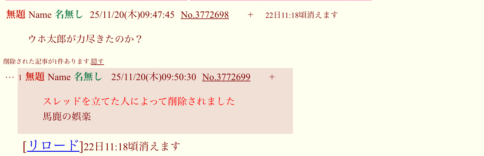 | … | 1無題Name名無し 25/11/20(木)09:50:30No.3772699+スレッドを立てた人によって削除されました |