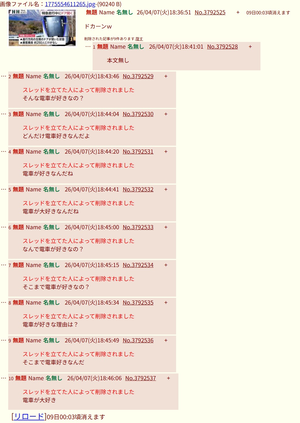 | … | 18無題Name名無し 26/04/07(火)20:23:02No.3792601そうだねx1電車だいすき |