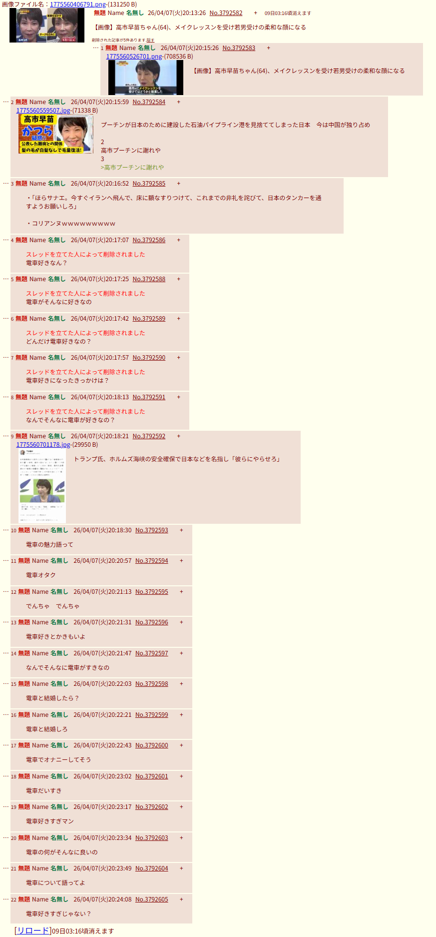 | … | 16無題Name名無し 26/04/07(火)20:22:21No.3792599そうだねx1電車と結婚しろ |