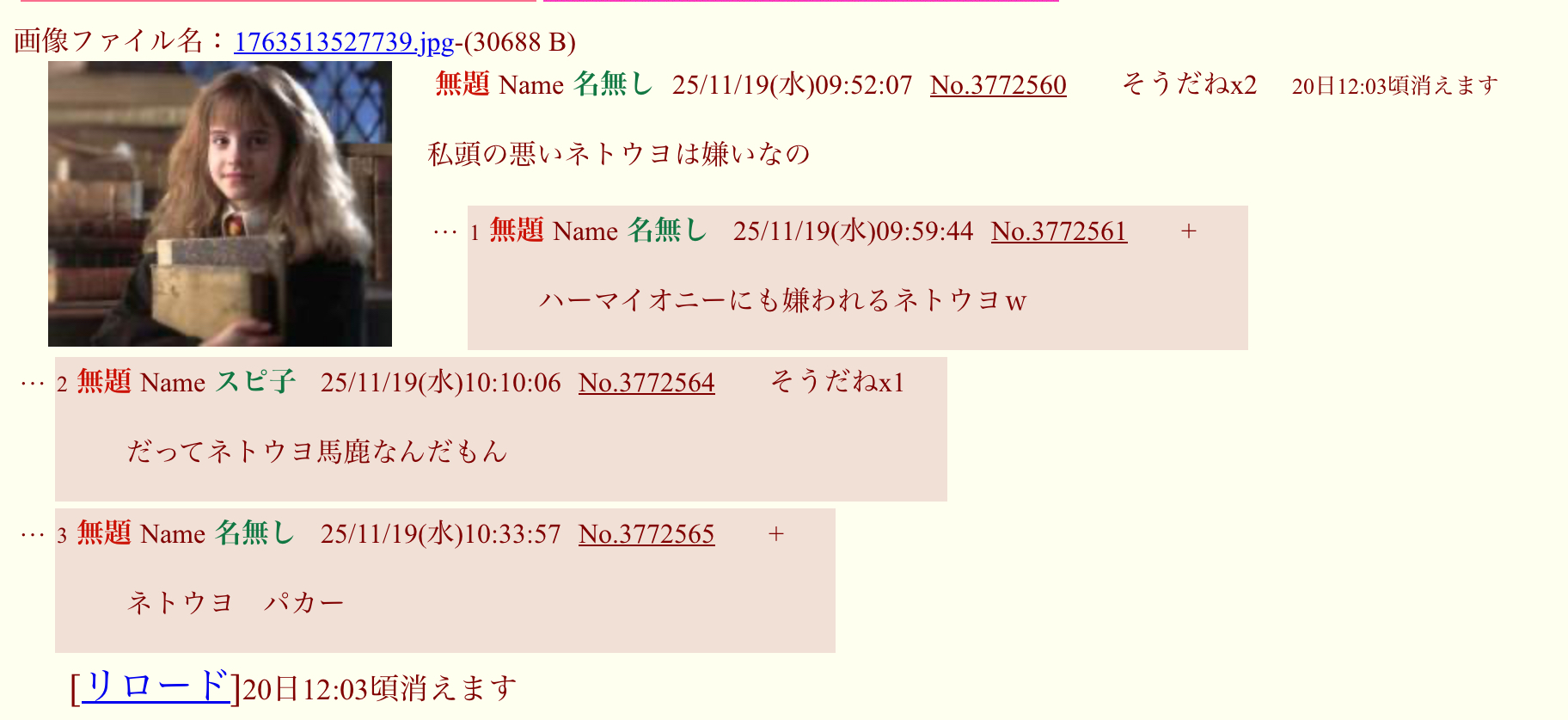 | … | 1無題Name名無し 25/11/19(水)09:59:44No.3772561そうだねx3ハーマイオニーにも嫌われるネトウヨw |