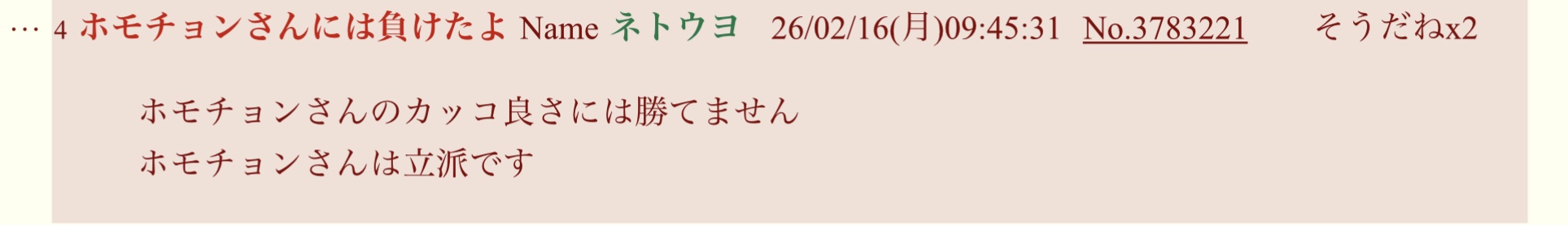 | … | 10無題Name名無し 26/02/20(金)12:56:45No.3783852そうだねx4またホモチョンのハゲ〜(≧∇≦) |