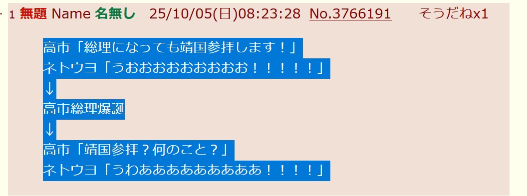 … | 1無題Name名無し 25/10/05(日)08:23:28No.3766191そうだねx1高市「総理になっても靖国参拝します!」 |