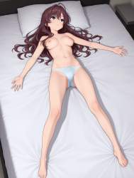 | … | 43無題Name名無し 26/02/18(水)21:27:03No.97090+ 1771417623654.jpg-(7002 B) tired, looking afar, on back, topless, nipples, spread arms, outstretched legs, legs apart, full body, panties, pillow, bed with white sheets |