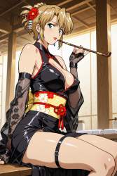 | … | 47無題Name名無し 26/02/18(水)21:52:47No.97095+ 1771419167808.jpg-(10637 B) hair ornament, kanzashi, looking at viewer, holding Japanese pipe, Japanese pipe to mouth, black top, chest cutout, cleavage, fishnet arm-covers, fingerless gloves,oriental aesthetic, sexy modern kimono-style outfit, leather gloves, sheer mesh sleeves, thigh_strap,bare_shoulders, ornate patterns, black skirt, floral print, red flowers, , indoors, washroom, shoji, wooden pillar, soft lighting,sitting,from side, |