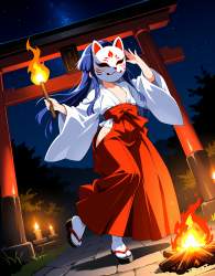| … | 76無題Name名無し 26/03/06(金)04:35:44No.97663+ 1772739344842.jpg-(11322 B) solo,full body,dancing,standing on one leg,alternate costume,(mask,fox mask,covered face,covered mouth:1.2),fire,bonfire,torch,night,starry sky,nipple slip,nipple,dynamic pose,dynamic angle,torii,groin,open clothes,revealing clothes,hip vent,red hakama,tabi, japanese clothes,sandals,miko, |