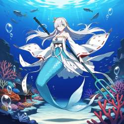 | … | 77無題Name名無し 26/03/06(金)04:36:15No.97664+ 1772739375537.jpg-(15627 B) 1girl, mermaid,fish tail, shell accessory,floating, underwater, coral reef, bubbles, gentle smile,nontraditional miko,detached sleeves,trident,holding weapon,shrine |