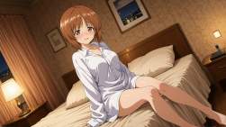| … | 14無題Name名無し 26/03/12(木)06:53:40No.97914+ 1773266020570.jpg-(7457 B) collared shirt, white shirt, long sleeves, naked shirt, loose clothes, oversized dress shirt only, sleeves past fingers, legs together, legs dangling, (sitting on the edge of the bed:1.5), indoors, hotel, bedroom, night, curtains, pillow, table lamp, warm lighting, faint light, very wide shot, dutch angle, full body, looking at viewer, |