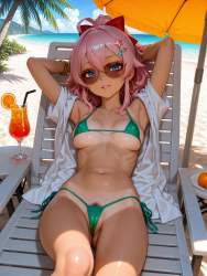 | … | 7無題Name名無し 26/04/04(土)22:23:43No.98783+ 1775309023950.jpg-(10637 B) 1girl, solo, hair red ribbon, breasts, navel, stomach, outdoors, teeth, parted lips, (micro bikini:1.2), halterneck bikini, side-tie bikini bottom, string bikini, pastel green bikini, thong, hip, ass visible through thighs, high ponytail, holding cup, sky, food, lying, (knee up:1.2), day, on back, armpits, cup, arms up, fruit, ocean, sunglasses, chair, beach, umbrella, arms behind head, drinking glass, parasol, reclining, orange (fruit), perple-framed eyewear, dark perple-tinted eyewear, beach chair, orange slice, lounge chair, (tan:0.8), hoop earrings, bracelet, sunbeam, lens flare, shirt, open shirt, palm tree, POV, |