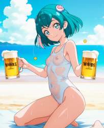 | … | 21無題Name名無し 26/04/05(日)22:10:23No.98819+ 1775394623973.jpg-(9050 B) A beer advertisement, a white one-piece see-through high-cut swimsuit, wet, nipples visible through the fabric, belly button visible through the fabric, camel toe, kneeling and smiling with a beer mug in her hand, from side,looking at viewer,on a beach, the sea, blue sky, white clouds, |