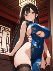 | … | 81無題Name名無し 26/04/09(木)06:05:04No.98956+ 1775682304977.jpg-(10052 B) blue china dress, sideless outfit, cleavage cutout, underboob cutout, sleeveless, covered nipples, |
