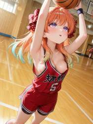 | … | 82無題Name名無し 26/04/09(木)06:06:33No.98957+ 1775682393549.jpg-(9592 B) 1girl, solo, basketball \(object\), basketball, black bike shorts, basketball uniform, red shirt, sleeveless shirt, over size tank top, sleeveless, downblouse, red shorts, open mouth, holding, teeth, sweat, armpits, arms up, cleavage, nipple slip, shooting, wristband, standing, looking up, sportswear, holding ball, school gymnasium, motion lines, from below, lower body, looking up, dramatic lighting, |