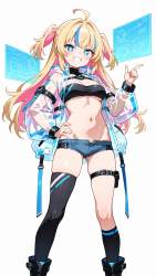 | … | 85無題Name名無し 26/04/09(木)06:10:46No.98960+ 1775682646281.jpg-(7717 B) looking at viewer, from front, (fromside :0.2), standing, one hand on hip , solo, 1girl, blonde hair, ahoge, hair_intakes, streaked hair, two side up, blue streaks, colored inner hair, pink hair, tsurime, blush, smile, :d, +_+, grin , navel, medium breasts, black bandeau, micro shorts,lowleg, circuit_board_print, asymmetrical_legwear, high sock, thighhigh, thigh belt, see-through jacket, lighting trim, boots , white background, holographic interface |