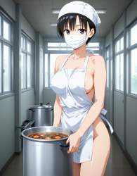| … | 34無題Name名無し 26/01/31(土)03:36:57No.96529+ 1769798217669.jpg-(8983 B) White cooking apron, white surgical cap, white surgical mask,big silver pot, pot with stew, school corridor, Carrying a large pot with both hands |