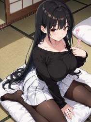 | … | 11無題Name名無し 26/01/28(水)21:29:22No.96443+ 1769603362345.jpg-(7489 B) spread legs,loose white sweater,lifting own sweater,holding hem of sweater, panties under pantyhose,white panties,black pantyhose,embarrassed,nose blush, no bra, looking away,twitching,wariza,living room,from front, |