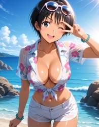| … | 68無題Name名無し 26/02/01(日)04:37:53No.96585+ 1769888273173.jpg-(10619 B) solo,;d,smile,v,cleavage,navel,collarbone,bead bracelet,eyewear on head,floral print,(See-through,white shorts,hawaiian shirt,tied shirt,bikini tan,No bra),wet body,Sky, sunlight,sea |