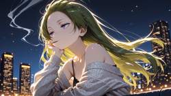 | … | 75無題Name名無し 26/02/01(日)04:45:47No.96592+ 1769888747634.jpg-(8985 B) alternate costume, cigarette in mouth, cigarette smoke, lace cardigan, open cardigan, camisole under cardigan, upper body, head rest on one elbow, one elbow on object, bare shoulders, (forehead), (wind), looking away, night, outdoor, skyscraper, night bokeh background, shallow depth of field, blurry background, from below, low angle, |
