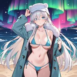 | … | 31無題Name名無し 26/03/13(金)04:20:18No.97949+ 1773343218520.jpg-(14713 B) 1girl,trapper hat, fur trapper hat, ear flaps, faux fur lining,collarbone,open coat, looking at viewer,micro bikini,hand on headwear,beach, night, aurora borealis, snowfall |