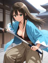 | … | 43無題Name名無し 26/03/13(金)22:57:23No.97972+ 1773410243653.jpg-(9902 B) serious, shinsengumi, blue haori, brown hakama, brown kimono, japanese clothes, nippple slip, holding katana, fighting stance, east asian architecture, town, blurry, |