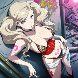 | … | 73無題Name名無し 26/03/15(日)03:32:09No.98034+ 1773513129738.jpg-(15098 B) choker,lace-trimmed leopard micro-bikini,thong,underbust,white denim open short shorts,leg tattoo,shoulder tattoo,pubic tattoo,leaning back on wall,standing,hand on cigarette,slums, |