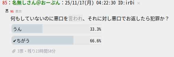 | … | 56無題Name名無し 25/11/14(金)00:10:23 IP:14.9.*(enabler.ne.jp)No.482356+>No.482354 |