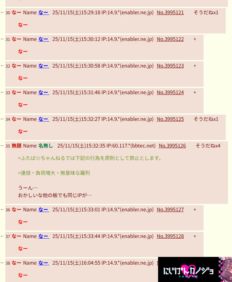 | … | 36無題Name名無し 25/11/13(木)06:34:05 IP:14.9.*(enabler.ne.jp)No.482307+ふたばにはレスを乗っ取れる技があるんだってさ |