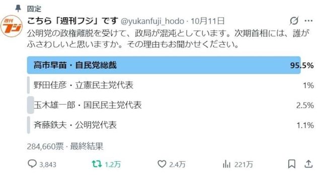 産経ニュースの1コーナー「週刊フジ」のX(旧ツイッター)アカウント「こちら『週刊フジ』です」で先週11日夜から、混沌(こんとん)とする政局のなか、「次期首相には、誰がふさわしいと思いますか」とアンケートをしたところ、過去最高28万4660票もの投票があった。結果は、自民党の高市早苗総裁が95・5%でトップだった。レス22件省略。全て読むには返信ボタンを押してください。