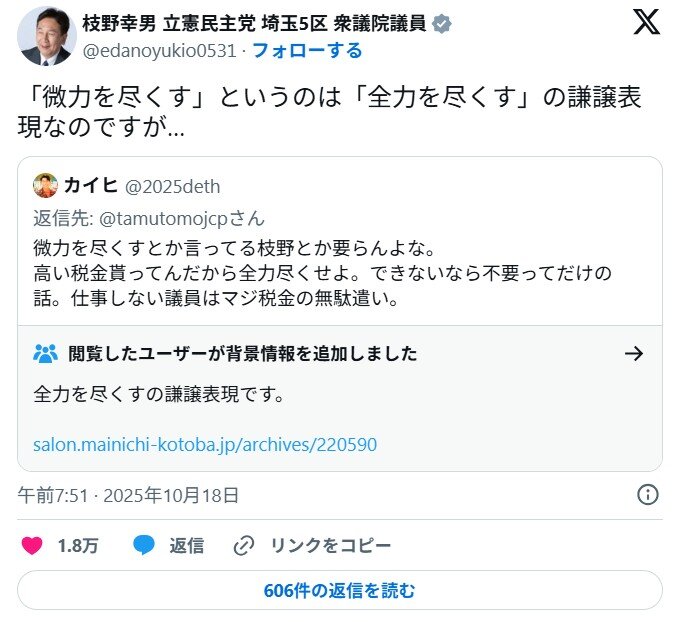 … | 1無題Name名無し 25/10/19(日)21:41:02 IP:153.191.*(ocn.ne.jp)No.4381591+ 1760877662669.jpg-(71922 B) ![]() この件について、枝野氏は「私のXのポストに、たくさんの反応をいただいています」と切り出すと「言うまでもありませんが“微力ではありますが、全力を尽くします”というのを省略した表現で、謙譲の言葉であります。残念ながら、こうした表現が伝わっていないんだな、というふうに思います」と複雑な表情を見せる。 |