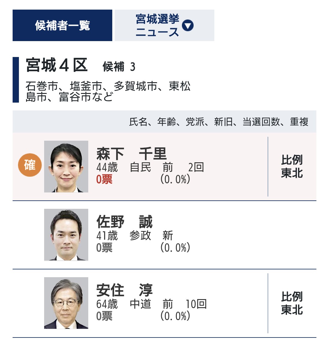 衆院宮城4区で、中道改革連合の安住淳・党共同幹事長の敗北と、自民党の森下千里・環境政務官の当選が確実になった。