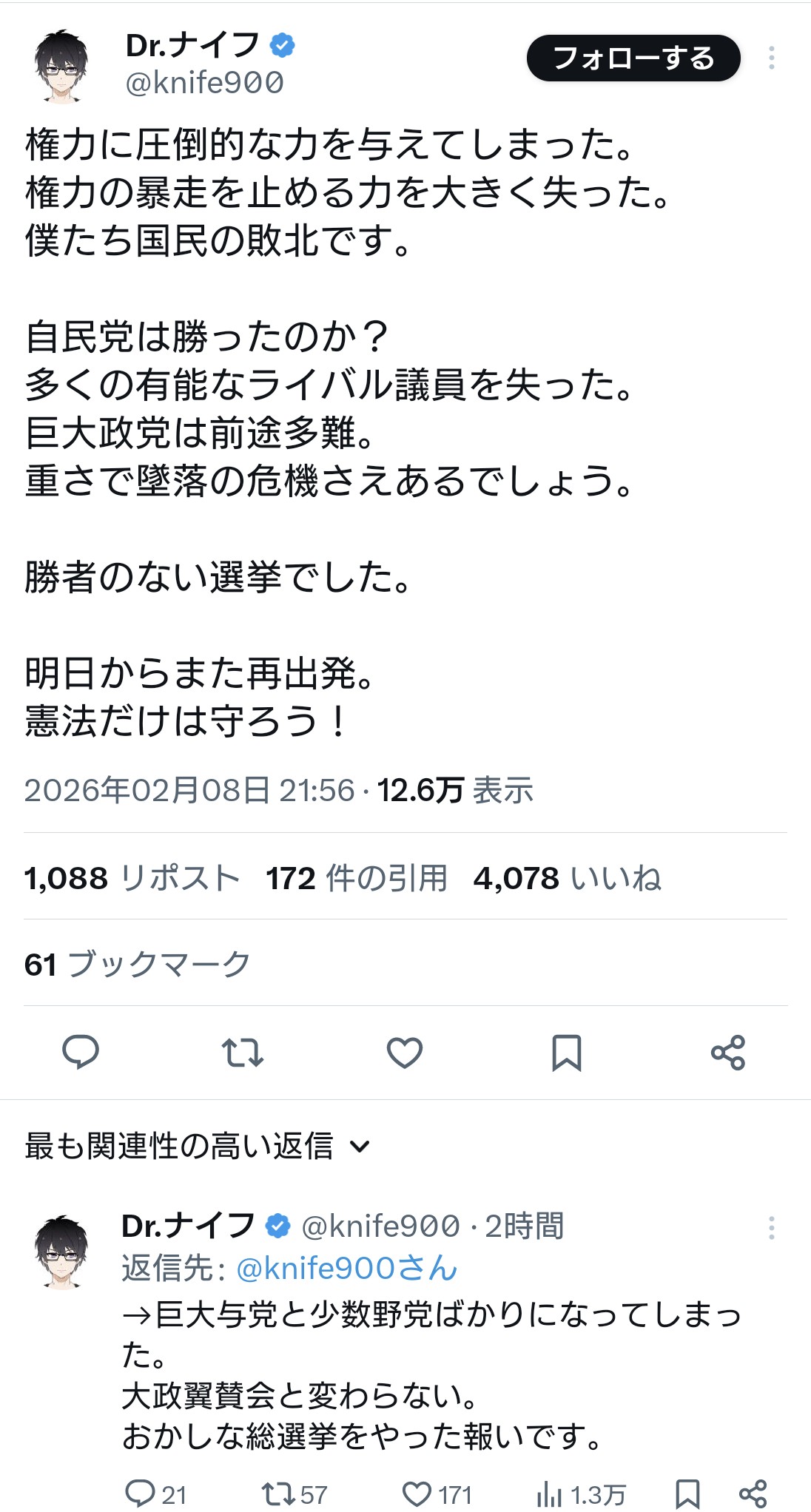| … | 27無題Name名無し 26/02/09(月)06:50:36 IP:210.194.*(home.ne.jp)No.4391574そうだねx2そういう意味では、政党支持率に見合った議席数になっただけよね |