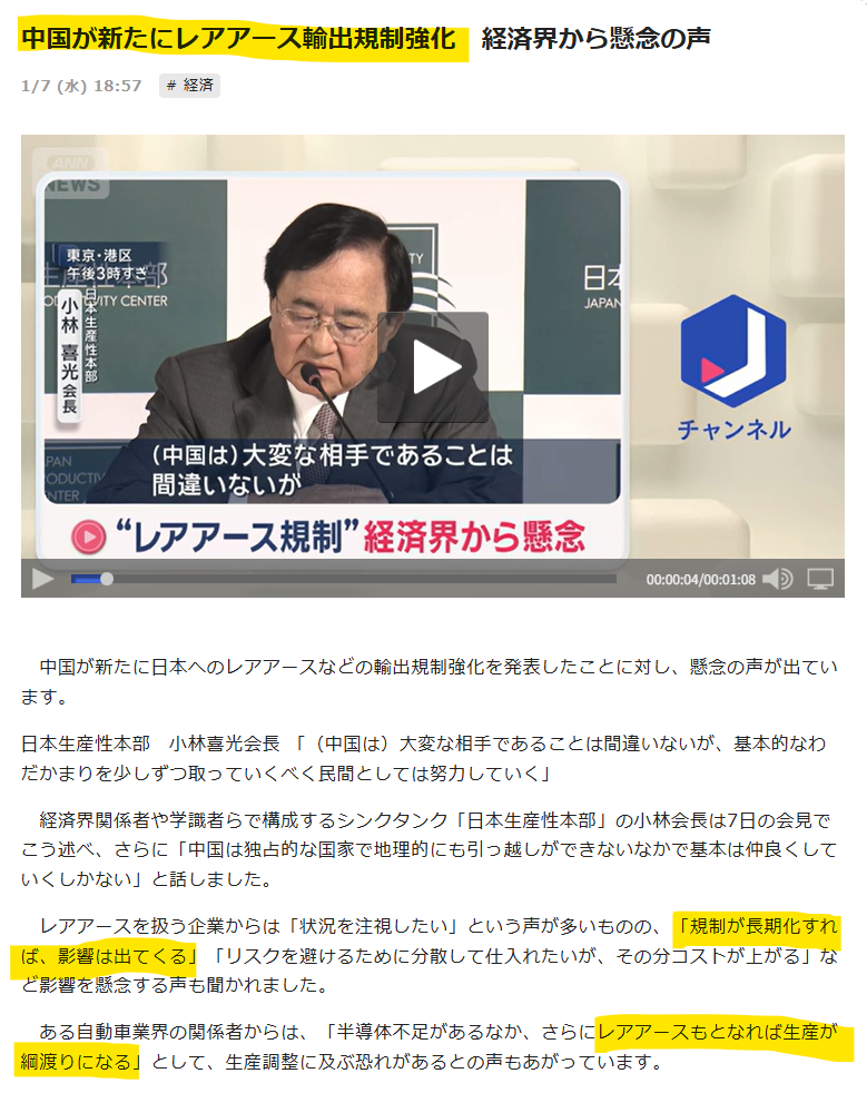 ◆中国が新たにレアアース輸出規制強化 経済界から懸念の声