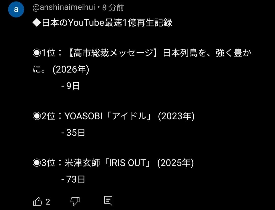 | … | 3無題Name名無し 26/02/07(土)14:56:03 IP:112.68.*(eonet.ne.jp)No.4391347+高市首相動画、異例の1億再生 SNS「広告」、疑問の声|YOASOBIは再生回数が一億回を超えるまでに35日を要したが、 |