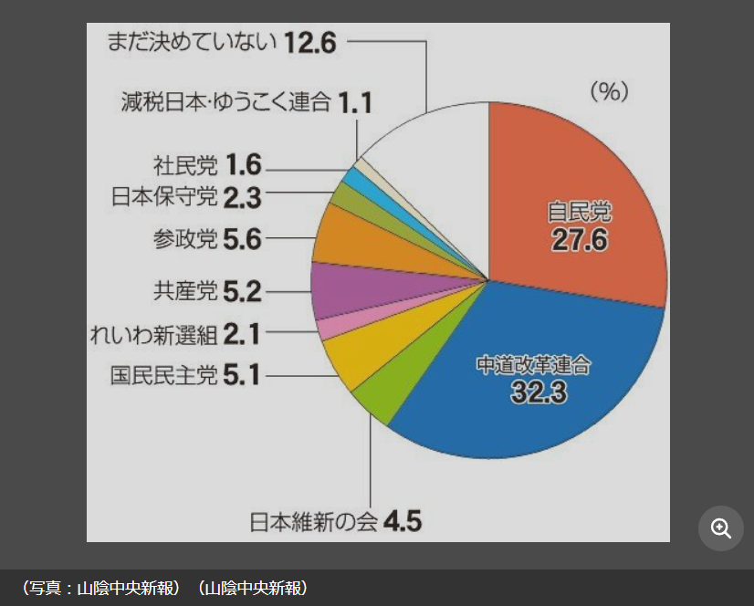 | … | 1無題Name名無し 26/02/05(木)22:01:48 IP:153.246.*(ocn.ne.jp)No.4391215+調査で鳥取県の比例投票先は中道が最多の32・3%で、自民を4・7ポイント上回った。一方、支持政党は自民が37・6%、中道が17・3%と2倍以上の差がある。自民支持層が選挙区は自民候補を選びながら、比例では一部が中道に流れているとみられる。 |