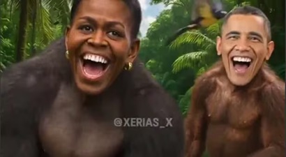 トランプ氏が5日夜に投稿したのは、2020年大統領選で不正が行われたとする陰謀論に関する映像。その終盤に、オバマ夫妻の顔とゴリラやオランウータンのような体が合成されたアニメ動画が差し込まれていた。