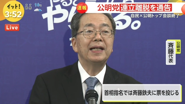 自公の連立協議を巡っては、特に自民党の派閥の政治資金事件を受けて、公明党が提示した企業団体献金の規制強化案について両党の溝が埋まらず、公明党内から「自民党が100%のめないなら間違いなく連立を離脱する」との声が聞かれる一方で、自民党内からも「丸のみはできない。ダメなら離脱は仕方ない」といった声があがっていて、連立解消は「避けられない」との見方が広がっていた。