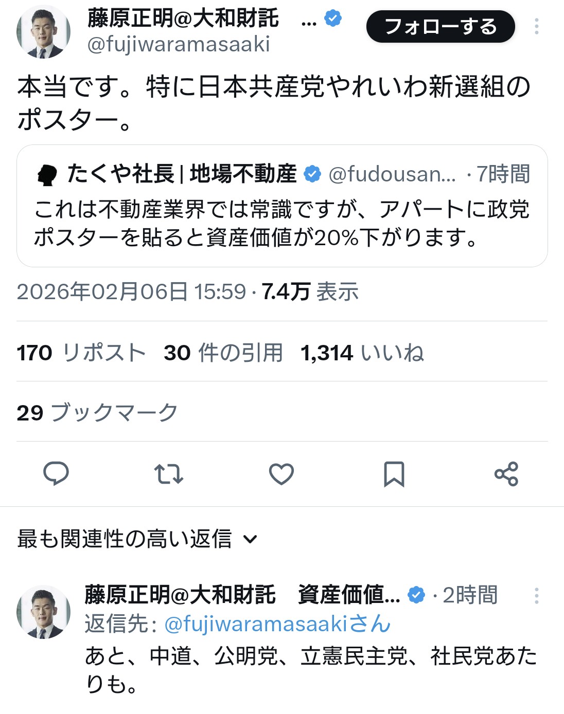 | … | 18無題Name名無し 26/02/08(日)07:12:28 IP:180.20.*(ocn.ne.jp)No.4391399そうだねx1 1770502348423.jpg-(1898666 B) 豆しば「ねぇ、知ってる〜?選挙ポスターを貼った建造物ってそれだけで資産価値が2割も下がるんだって〜」 |