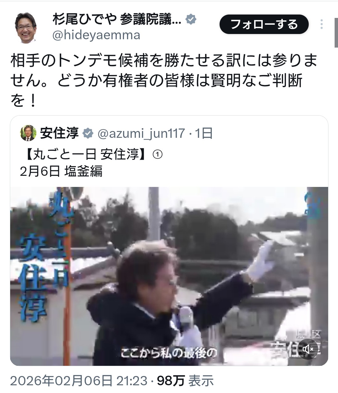 | … | 11無題Name名無し 26/02/07(土)19:57:59 IP:106.128.*(au-net.ne.jp)No.4391370そうだねx5 1770461879638.jpg-(191584 B) 対立候補の森下をよそ者とかトンデモとか |