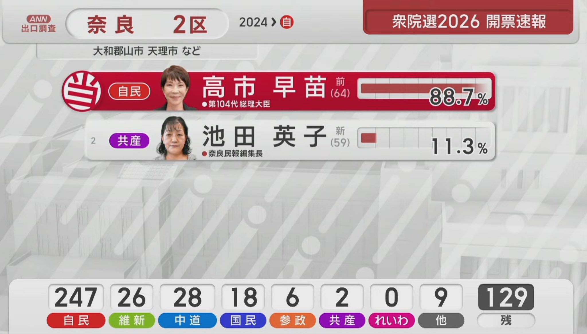 公示前議席198だった自民党は、単独で3分の2を超える315を獲得して圧勝した。中道改革連合は、公示前167から49に減らし惨敗。自民と連立政権を組む日本維新の会は34から36、国民民主党は27から28へ上積みした。