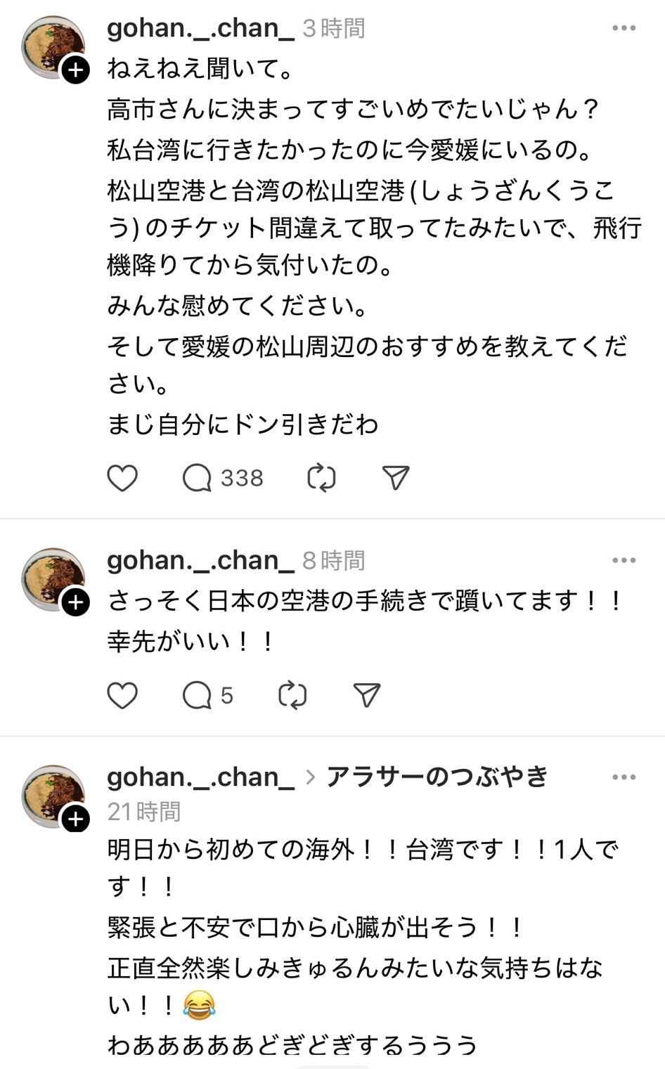 … | 925/10/22(水)22:38:58No.76115946+松山空港なら桃園国際空港行きがあるからどうしても行きたいならリカバリ効いただろ |