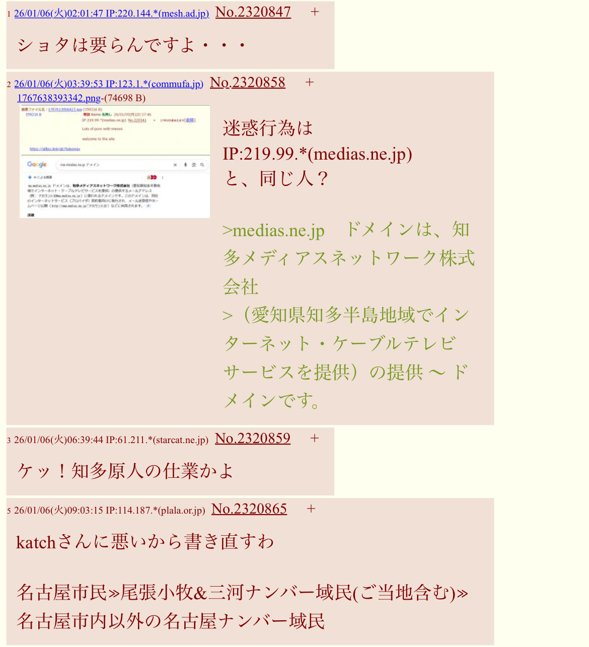 | … | 326/01/06(火)17:29:55 IP:114.187.*(plala.or.jp)No.2320909+>No.2320899 |