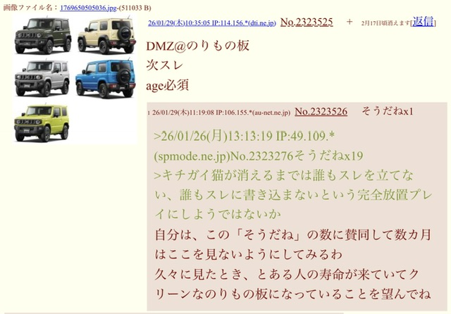 | … | 326/01/26(月)16:35:30 IP:114.187.*(plala.or.jp)No.2323302+ 1769412930572.jpg-(73274 B) 旧車に対しては規制が甘いからとやりたい放題の奴らがいる |