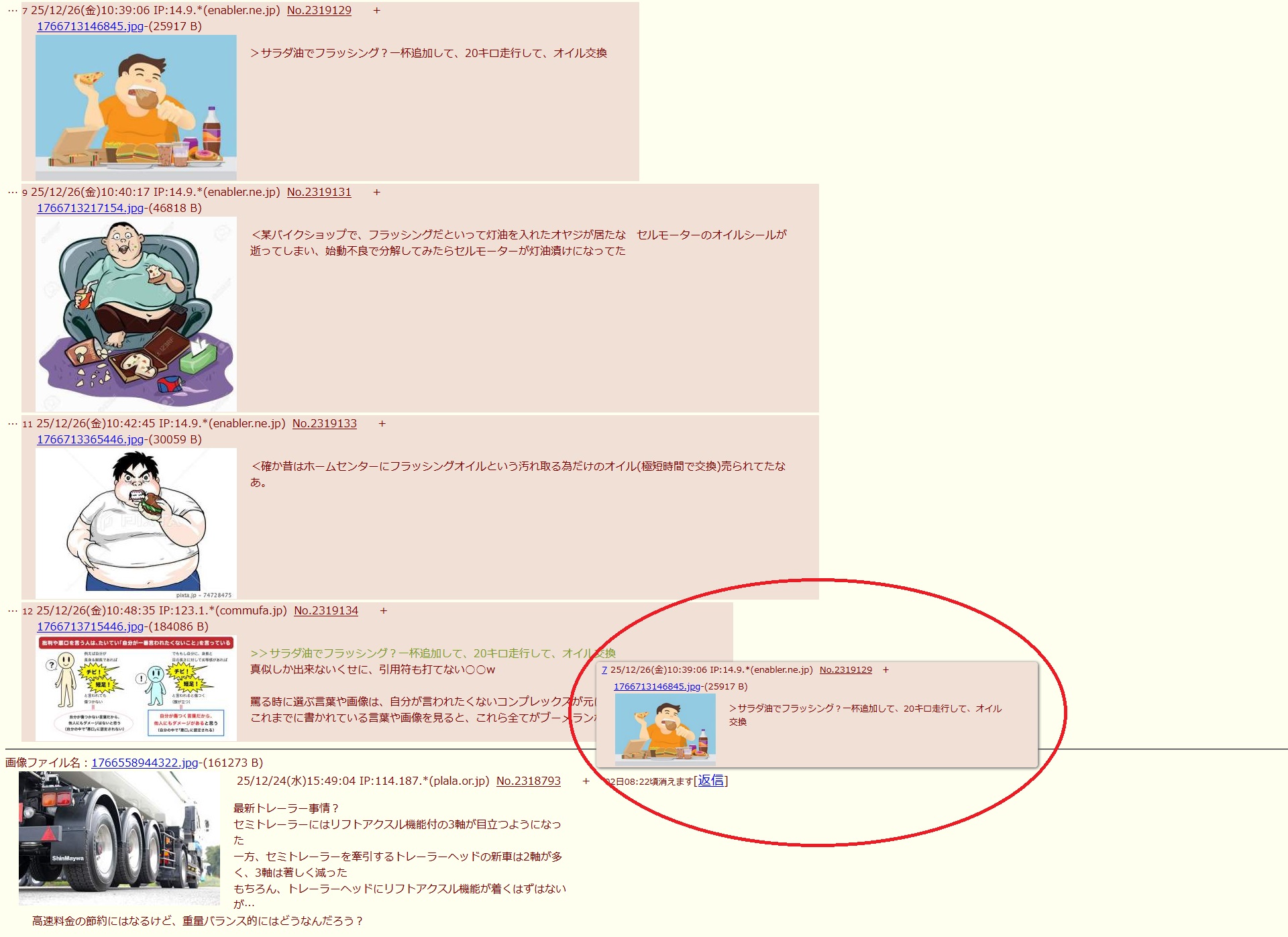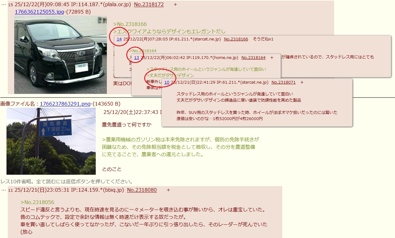 | … | 725/12/25(木)17:44:25 IP:114.187.*(plala.or.jp)No.2318993+家の某ターボ車はバブリング音、うるせえ… |
