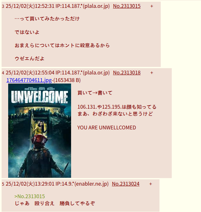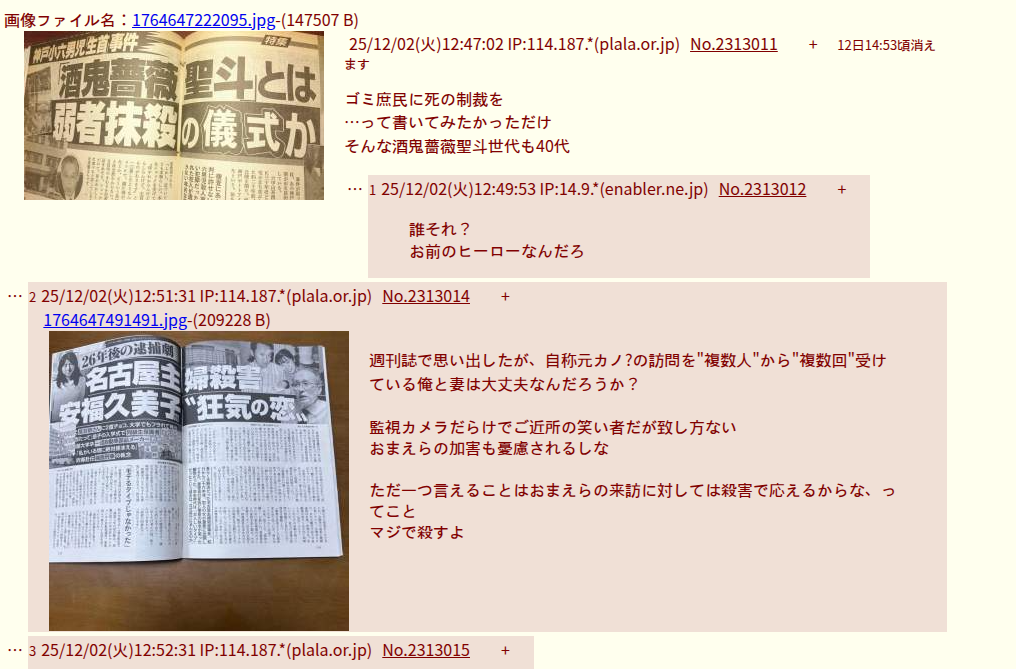 | … | 2025/12/02(火)13:46:16 IP:114.187.*(plala.or.jp)No.2313041+なんちゃってスレだけど、一見して表現が不穏だから仕方がない |