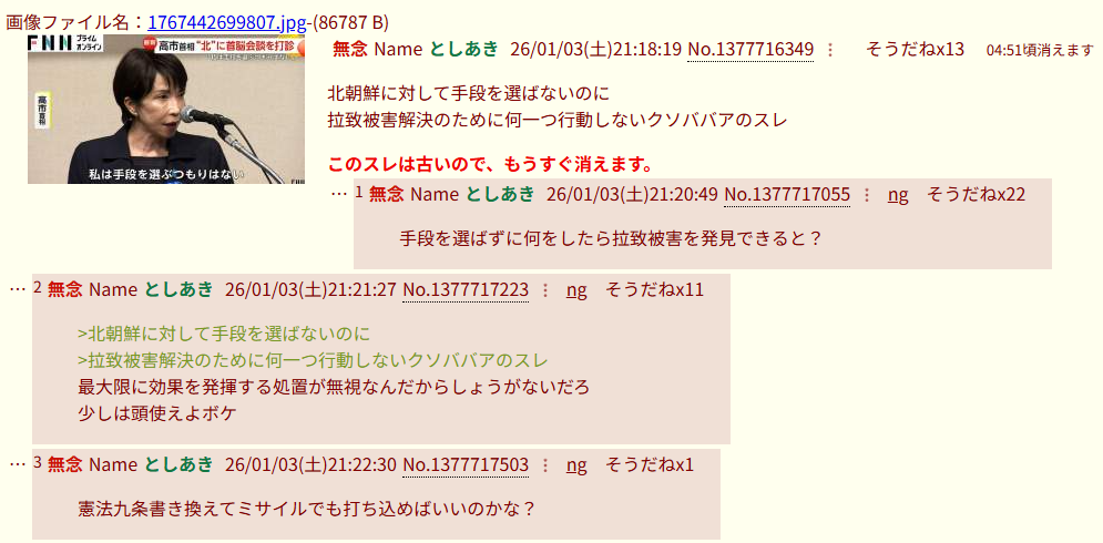 | … | 26無題Name名無し 26/01/04(日)20:00:12No.3374383+>また中身のない高市批判で夜が更ける |