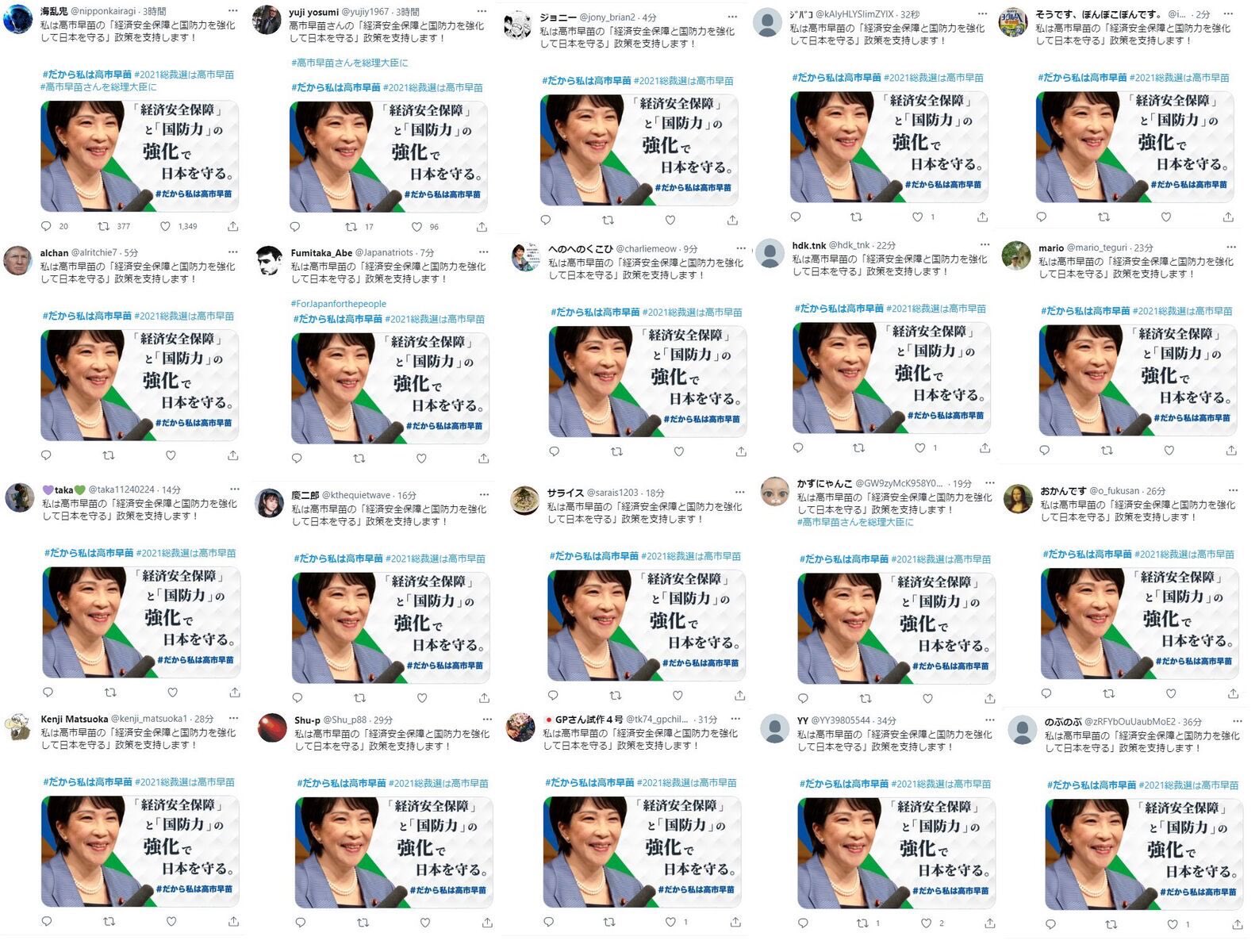 調査したのは、ネット上の言論空間分析を手がける「ジャパン・ネクサス・インテリジェンス」(東京)。アカウント群による活動は衆院選公示(1月27日)の約1週間前に始まり、日本語や英語で「首相が旧統一教会から票を買っている」「首相は軍備増強と歴史修正に道を開いた」「社会保障の若者負担が増す」などの主張を投稿・拡散している。