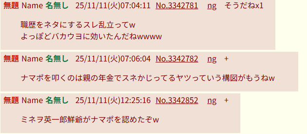 | … | 13無題Name名無し 25/11/10(月)21:03:01No.3342659+この件でミネヲ英一郎鮮爺は怒りMAX |