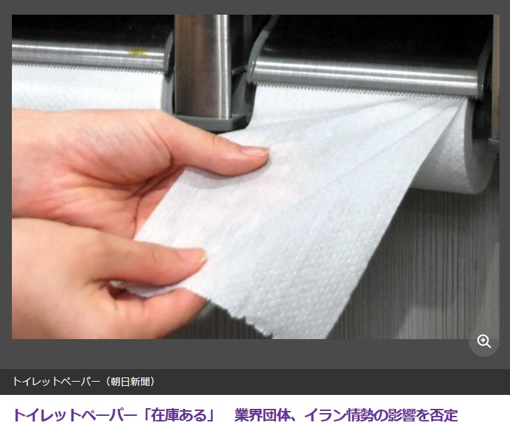 トイレットペーパー「在庫ある」業界団体、イラン情勢の影響を否定削除された記事が1件あります.見る