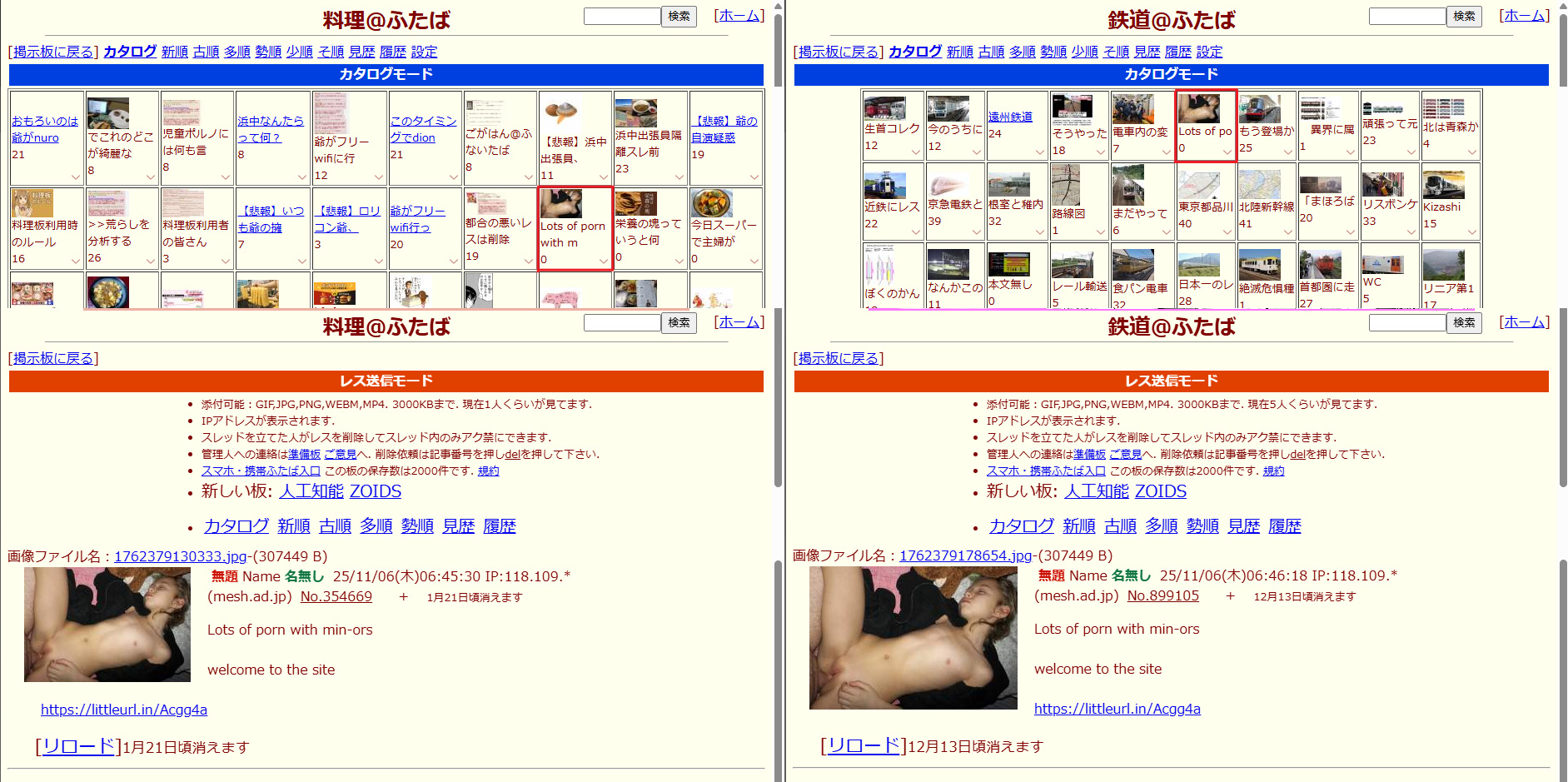 今朝とさっきのエロ業者の立てたスレに対してpandaが張り切って流しを行なったのですが、ほぼ同時刻にエロ業者スレが立った鉄道板では誰も騒がずさりとて放置もせずに(del)した結果あちらは既に消え、料理板の方はまだ残っています。